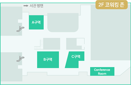 로비 2층 서관 방면에는 협업 공간들이 집중적으로 배치되어 있어
